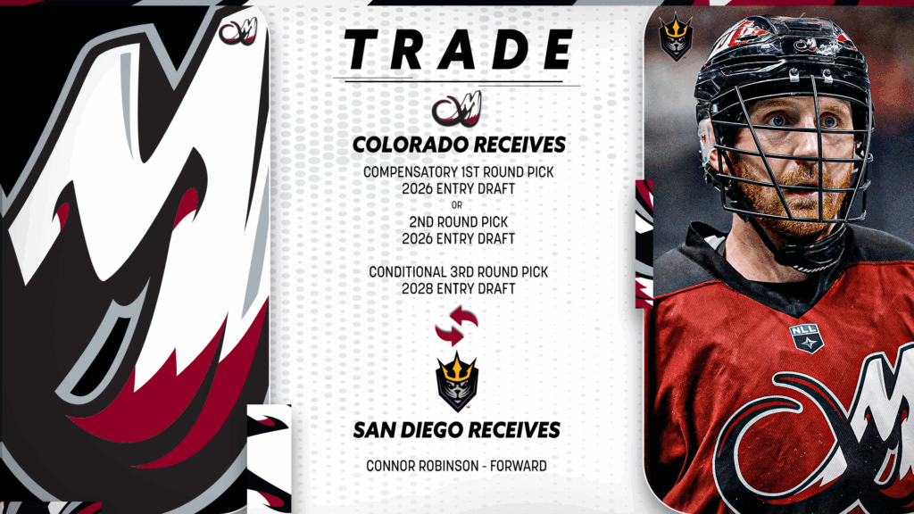 A second-round selection in the 2026 NLL Entry Draft and a conditional third-round selection in the 2028 NLL Entry Draft. The third-round selection in the 2028 NLL Entry Draft Colorado receives can become a second-round selection in the 2029 NLL Entry Draft if Robinson signs with San Diego ahead of the 2026-27 campaign.