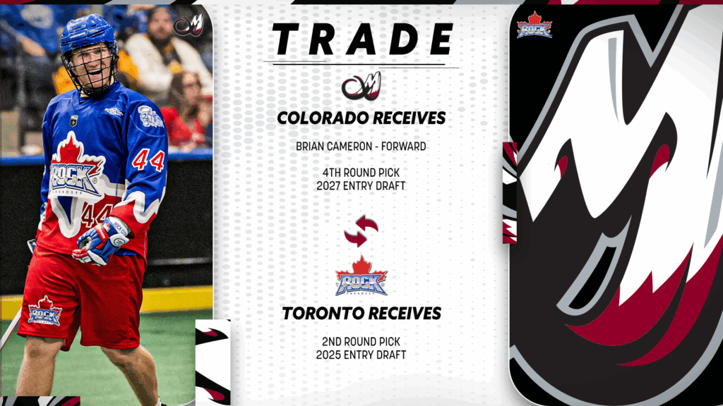 DENVER – The Colorado Mammoth of the National Lacrosse League (NLL) today announced the organization acquired forward Brian Cameron and a fourth-round selection in the 2027 NLL Entry Draft from the Toronto Rock in exchange for a second-round selection in the 2027 NLL Entry Draft.