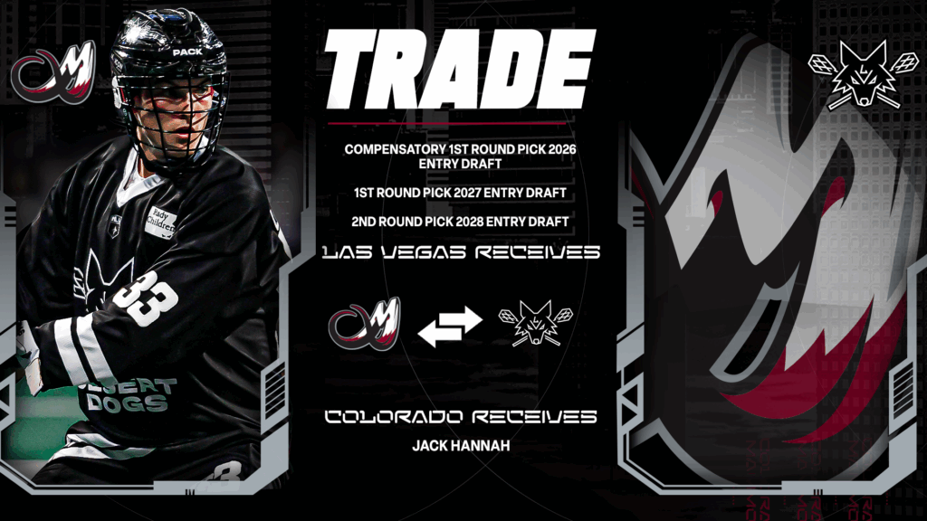 DENVER – The Colorado Mammoth of the National Lacrosse League (NLL) today announced the organization acquired forward Jack Hannah from the Las Vegas Desert Dogs in exchange for a compensatory first-round selection in the 2026 NLL Entry Draft, a first-round selection in the 2027 NLL Entry Draft and a second-round selection in the 2028 NLL Entry Draft.
